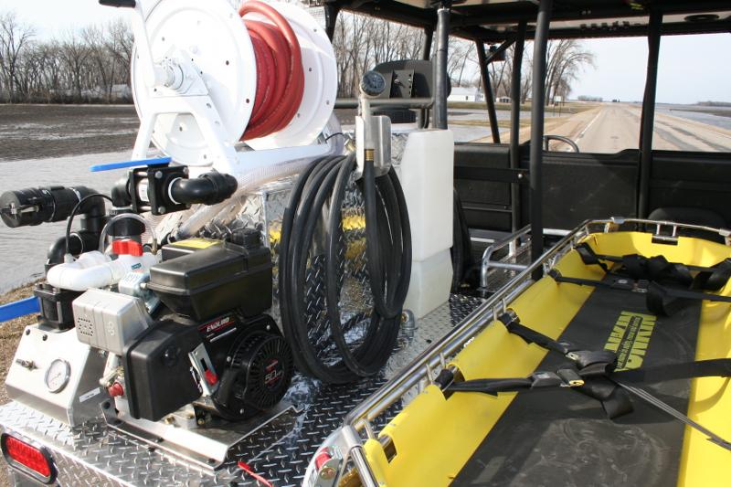 - High pressure self-priming pump powered by a 5 HP gasoline engine, foam injection system, and 50 feet of