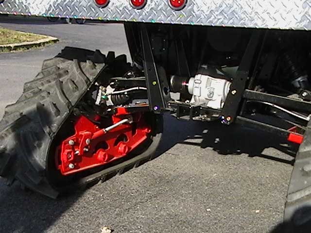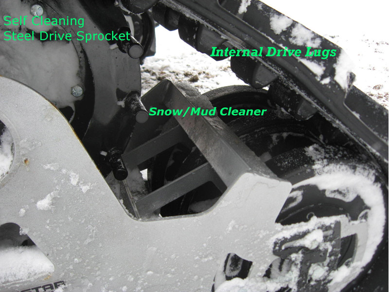 The tracks are a deep lug aggressive chevron design with a rubber internal drive giving ultimate off-road capability with low vibration and smooth running. Extra wide, large diameter internal rubber wheels provide low rolling resistance and track support. Scrapers on the internal wheels in combination with the steel, self cleaning drive sprockets prevent mud or ice buildup in extreme conditions.