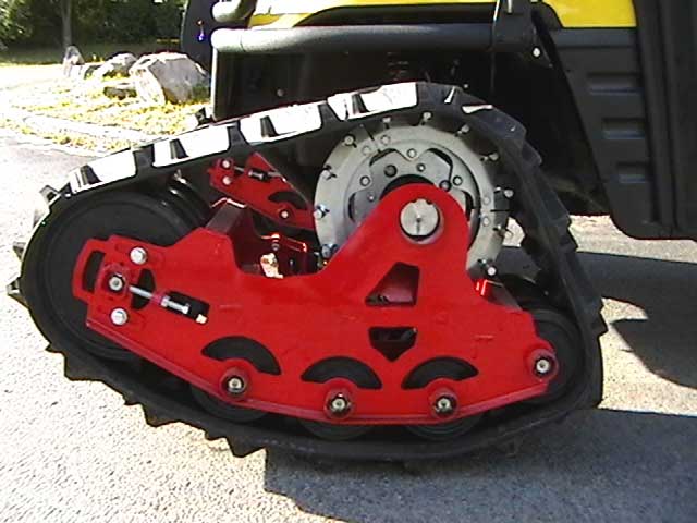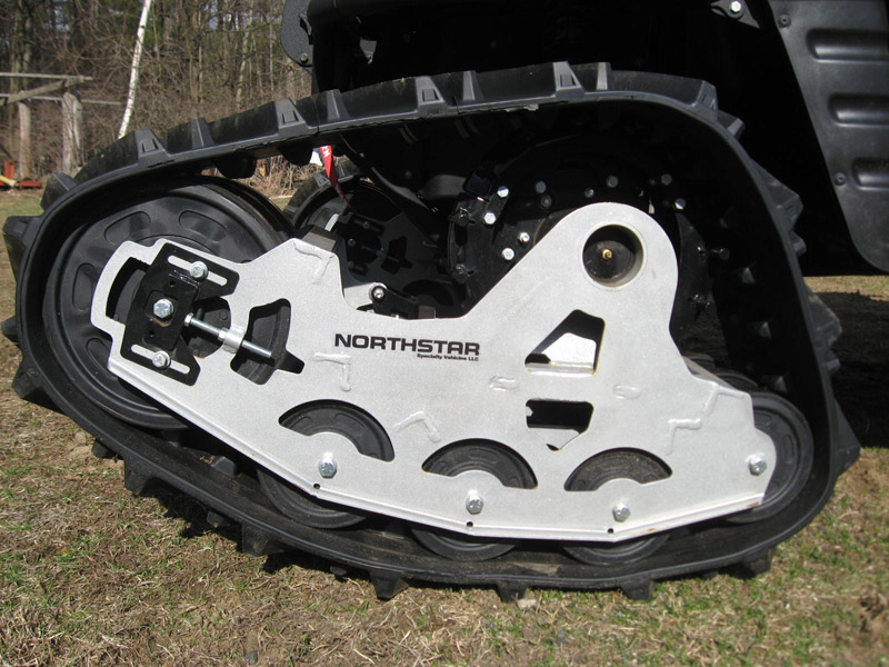 The steel internal track frame gives strong support to the tracks preventing ratcheting and derailing. The track frame profile provides optimum ride with low steering effort. A steering dampener virtually eliminates steering feedback giving smooth steering. Heavy duty reinforced front A-arms and large lower ball joints stand up to the heavy loading from the track system.